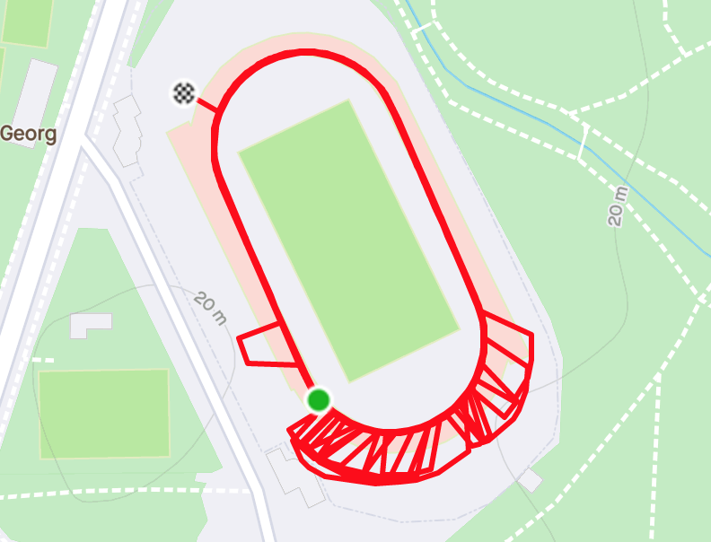 Im Übrigen gibt es auch schon GPS-Uhren die man im Bahnlauf-Modus betreiben kann (z.B. Garmin f?nix 6X). Unten siehst du einen entsprechenden Track. Dieser sieht sehr interessant aus, vermutlich gleicht die Uhr dort Ungenauigkeiten aus. Der Läufer lief insgesamt 20,3 km auf Bahn 1. Hierbei stimmt die Distanz auffallend gut. Es sind genau 50 3/4 Runden.